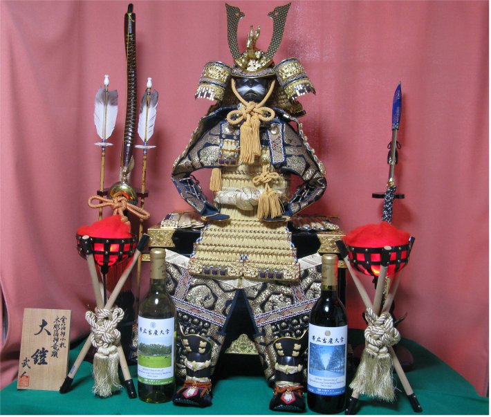 明日になると花しょうぶと柏餅を飾る予定ですが、今日は長男が通ってる大学産のワインを飾ってみました