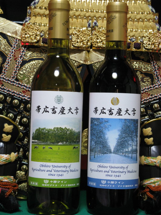 赤・白のワインを送ってもらい にぎやかしに並べて見ました ラベルは学内の通りと牧場らしいです