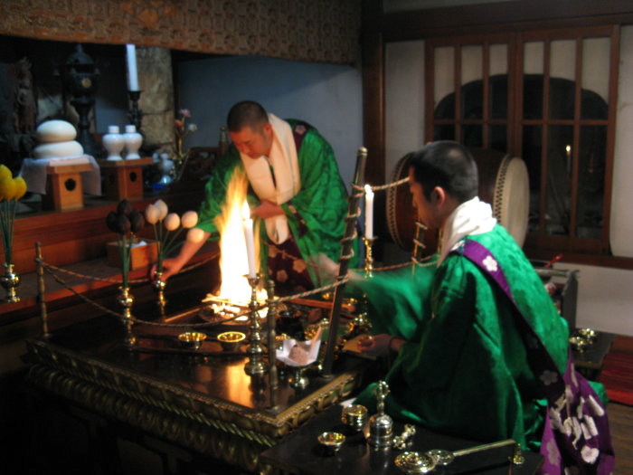 護摩を焚いて節分の厄除けの豆を清めてこれから豆をまきはじめます